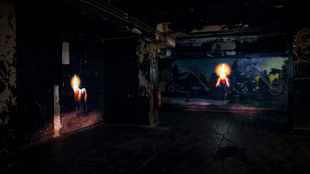 《On the Road》 is a video installation work that commemorates wild animals whose lives ended as roadkill. Inspired by repeated encounters with these deaths, the work places viewers on a dark night road. Against the quiet sounds of the forest, wild animals appear one by one, their heads replaced with flickering candles, approaching silently. They neither attack nor demand—they simply exist, lingering around the viewer.